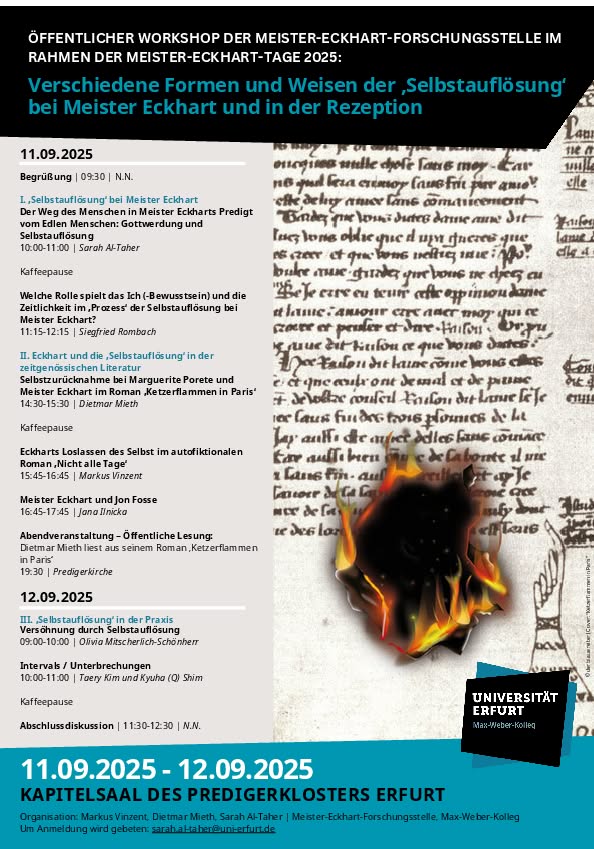 Der Workshop untersuchte das vielschichtige Konzept der „Selbstauflösung“ bei Meister Eckhart sowie seine Wirkungsgeschichte in Literatur, Philosophie, Theologie und Kunst. Ziel ist es, zentrale Fragen nach Identität, Subjektivität und Transformation interdisziplinär zu beleuchten und mit gegenwärtigen gesellschaftlichen Erfahrungen in Beziehung zu setzen.